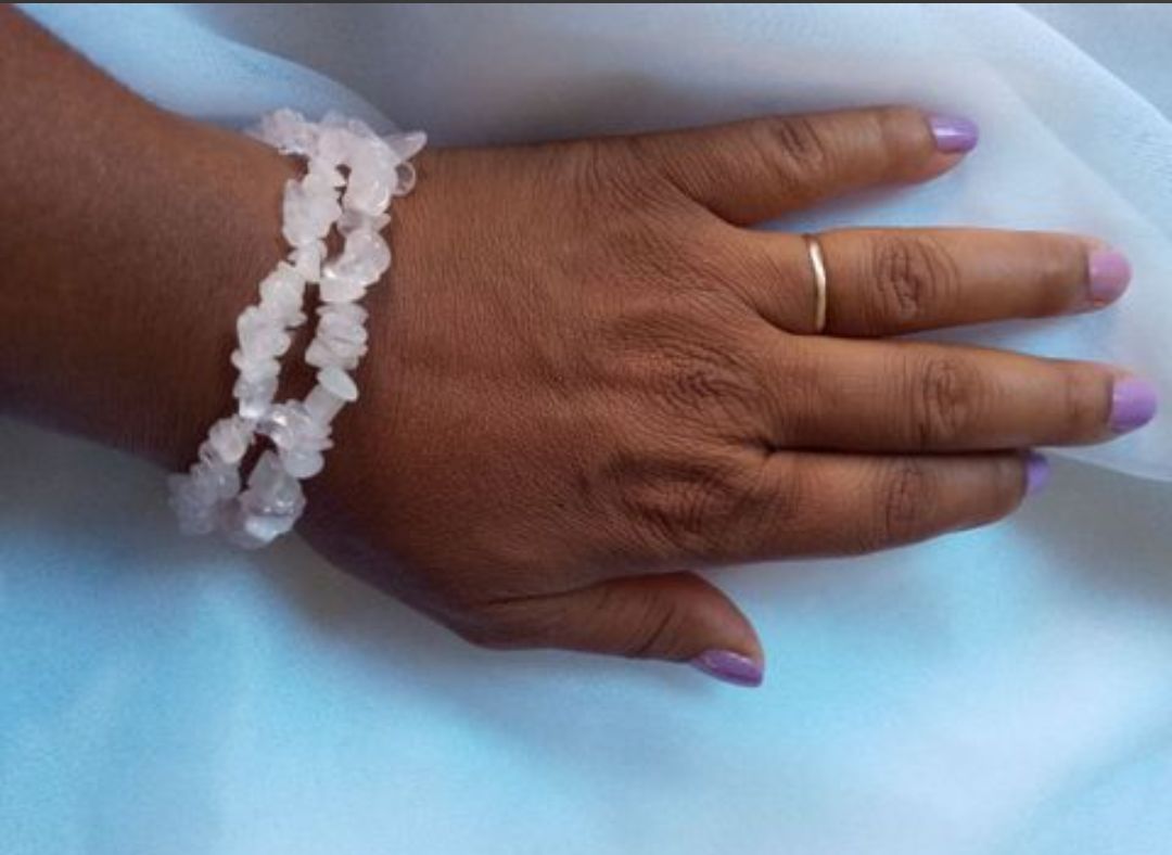 Pulseira de Pedra Natural Quartzo Rosa, feita com pedra natural quartzo rosa e fio de silicone elástico resistente.